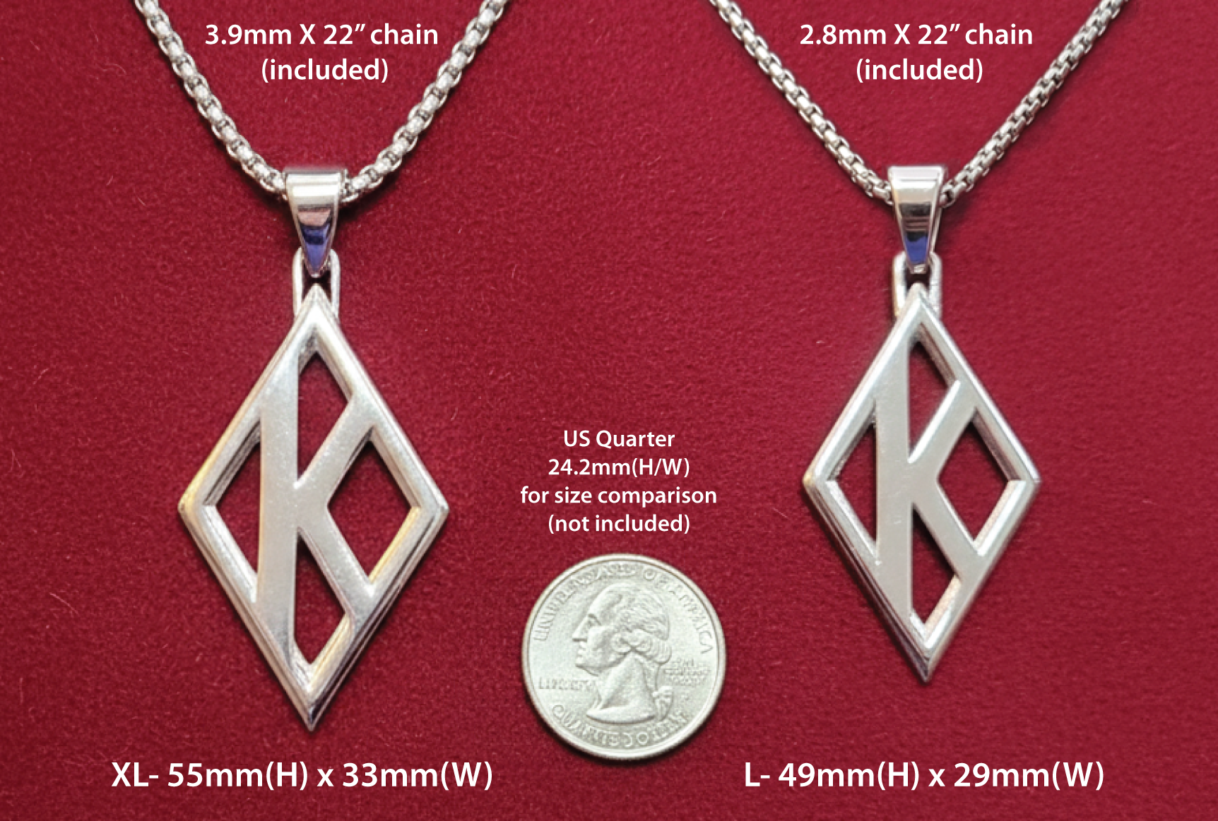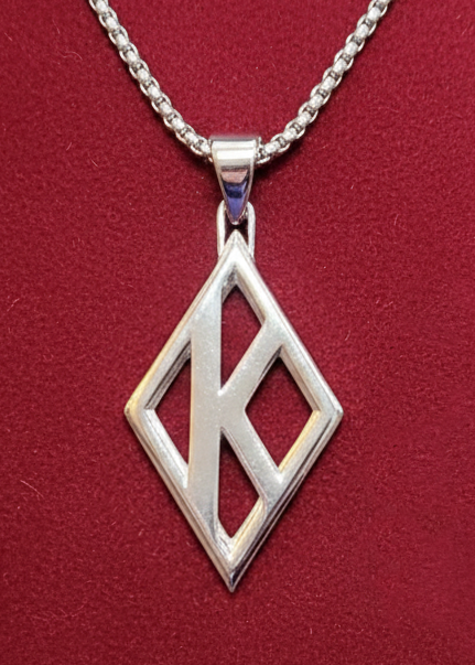 Our largest Kappa diamond in stainless steel with a 3.9mm thick rounded box link chain.